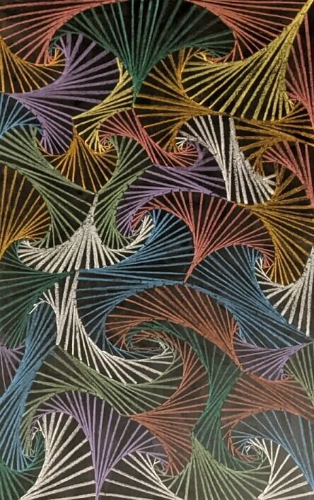 This was the pandemic, so I had tons of free time; I began to draw the geomoetric pattern on the chalkboard using the Hagoromo. My earliest efforts are shown at the bottom of this page. The addition of color, which I had not previously seen (I used single colors in my notebook doodles), put a very compelling new dimension into the artwork.